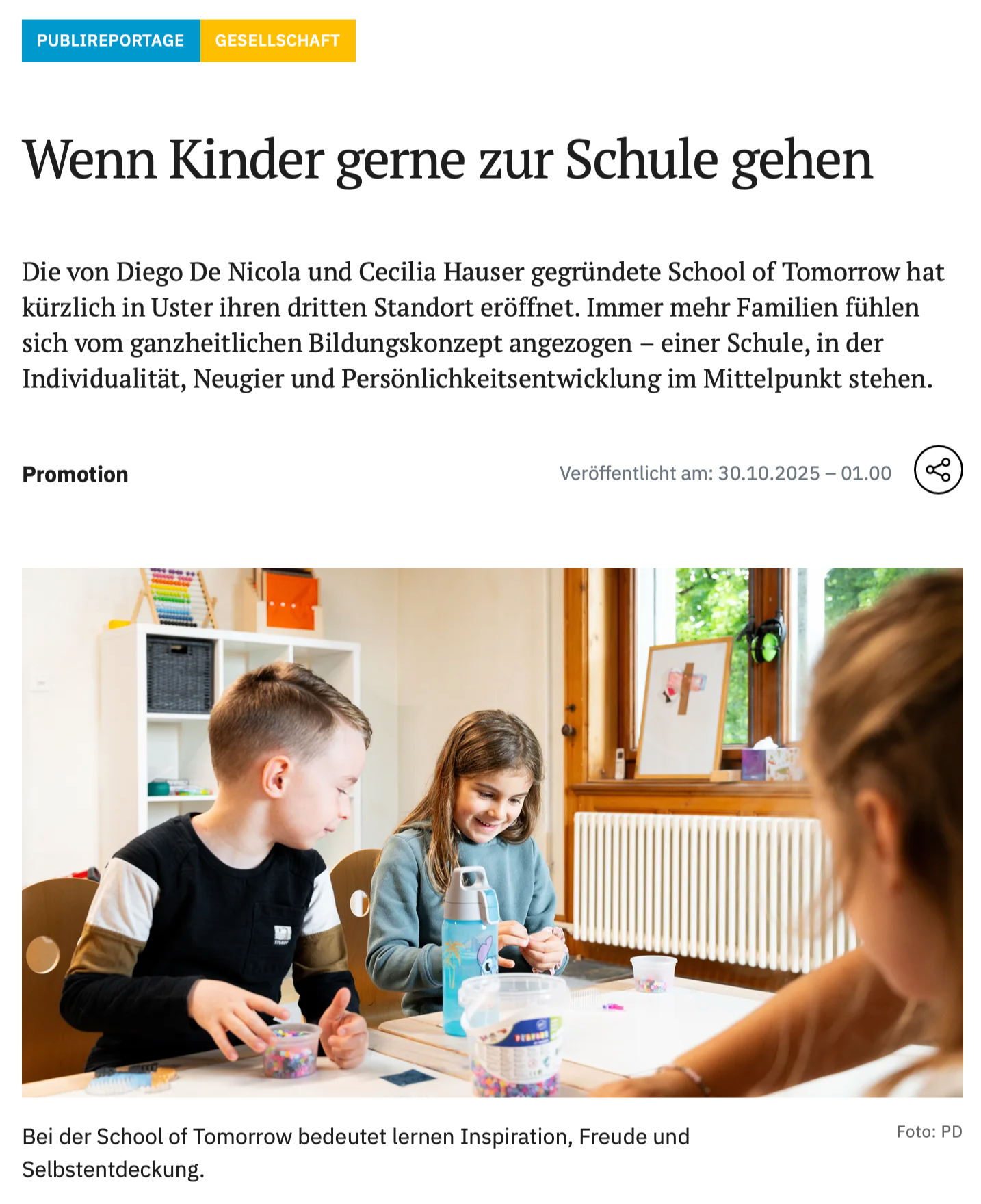 – Als sich die Nachricht über die Belp Volksschule und ihr Modell mit vier Schultagen und sechs Wochen Ferien verbreitete, hat sich der Tages-Anzeiger nach unseren Erfahrungen erkundigt. Wie funktioniert das Modell, wie setzen wir es an der School of Tomorrow um und welche Erfahrungen haben wir damit gemacht? So erfährst du mehr im Artikel.